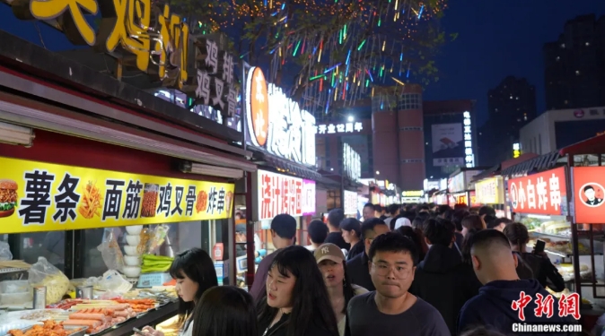 图片图为游客在摊位前购买炸货食品。梁泽林 摄