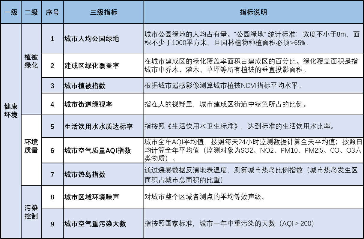 “清华城市健康环境指数”还构建了一套全面量化的规范性指标体系,涵盖3个二级指标和9个三级指标。其中,“植被绿化”板块设计了城市人均公园绿地、建成区绿化覆盖率、城市植被指数、城市街道绿视率等三级指标,从城市三维空间到居民直接感受,客观反映绿色资源的建设效果;“环境质量”领域立足空气、水、温度等健康影响要素,选取了生活饮用水水质达标率、城市空气质量指数(AQI)、城市热岛指数等三级指标;“污染控制”方面以人体生理和心理健康为考量因素,设立了城市区域环境噪声、城市空气重污染天数等三级指标。