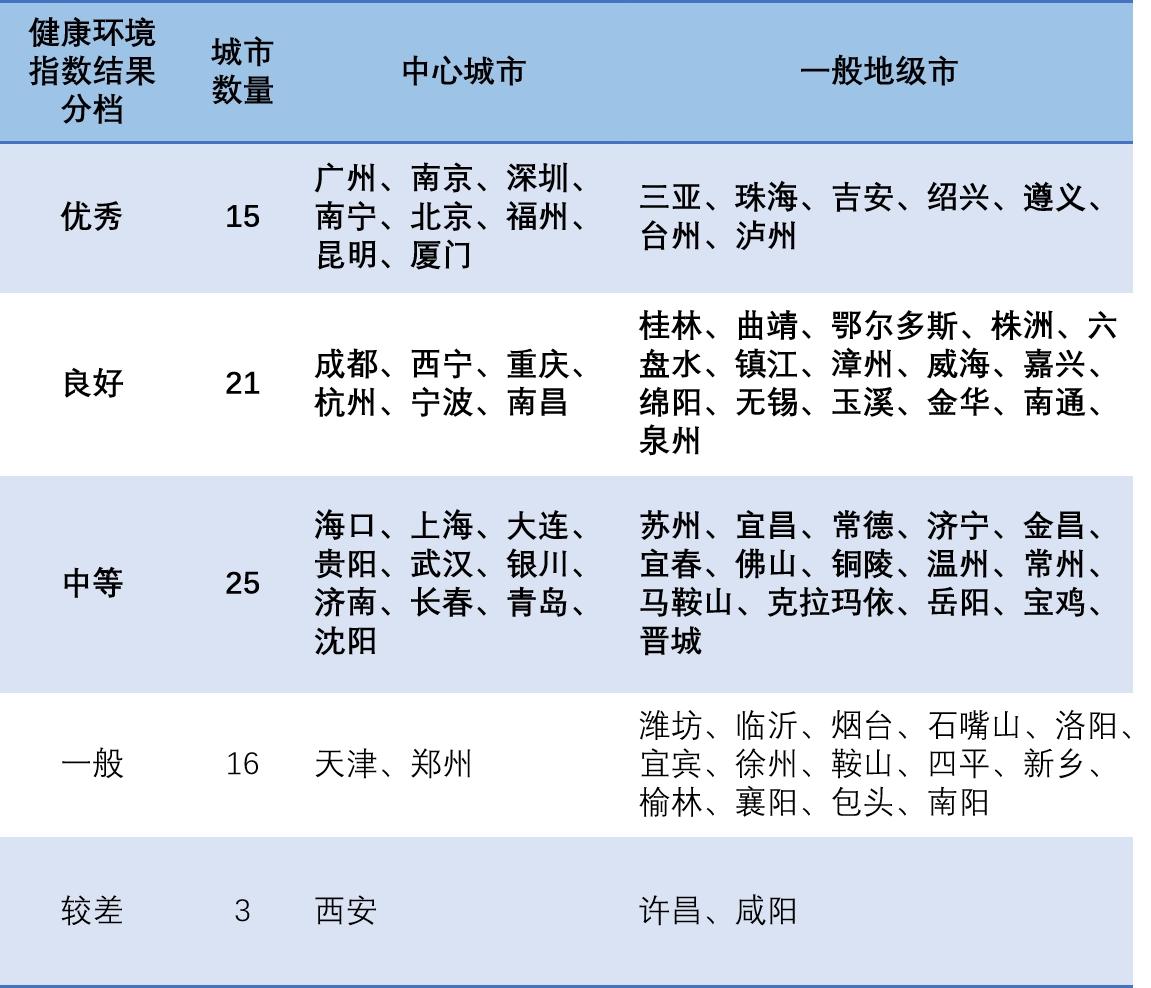 按照优秀、良好、中等、一般、较差五个等级对我国城市健康环境指数分值整体水平进行评价。结果显示:我国城市健康环境指数整体水平较好;在参与评级的80个城市中,处于优秀等级的城市15个,良好等级城市21个,中等等级城市25个,一般等级城市16个,较差城市3个;中等水平及以上城市数量占比达76%,一般和较差水平的城市数量占比为24%。
