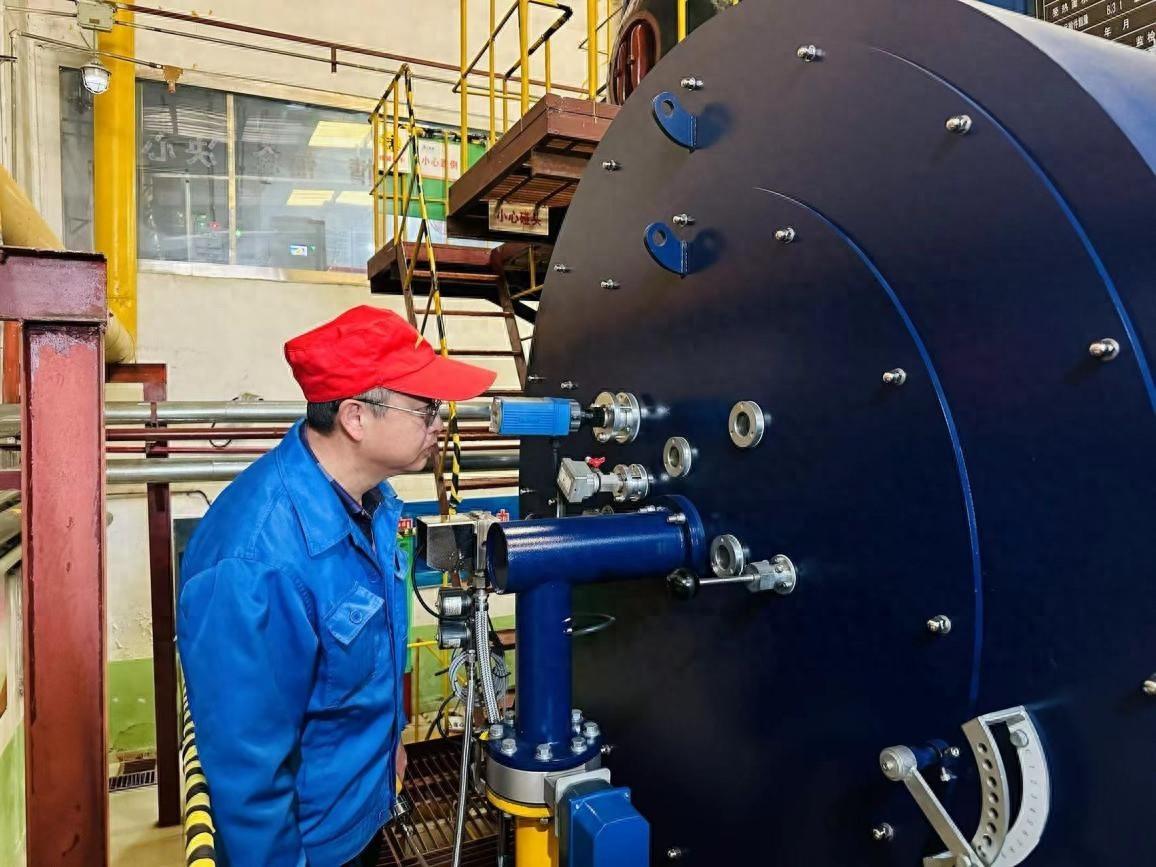 司炉工梁任秋正在通过观火孔检查锅炉燃烧机火焰是否正常。
