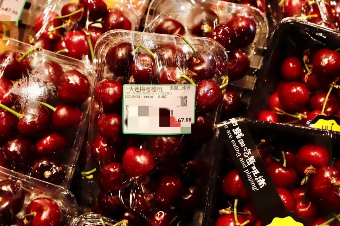 随后,记者来到市区一家商超,注意到现场售卖的樱桃基本都是已经包装好的小盒装,且相较于市场,数量较少、价格偏高。“目前在售卖的以水晶樱桃和大连美早樱桃为主,一斤的价格分别在70元和80元左右,都是非常新鲜的。”售货员王女士向记者介绍道,由于樱桃不好储存,所以进货的量也有限。