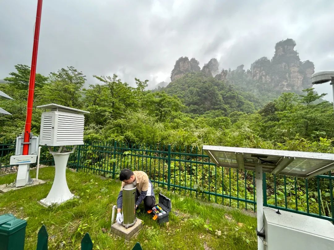为保障气象观测数据正常,市气象局装备中心工作人员陈诺驱车41公里前往张家界十里画廊对自动站进行巡查和维护,仔细确认百叶箱内仪器和雨量传感器运行正常,确保气象数据准确采集和及时传输。此外,假期期间,他每日都要前往武陵源对区域自动站进行巡查。这几年,武陵源区已相继建设并升级区域自动气象站18个,12个站点加装了实景观测设备。