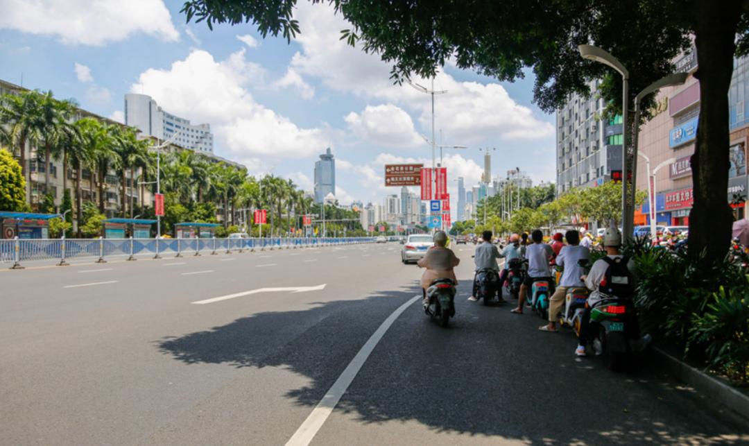 近日,在南宁市民族大道上,不少电动自行车骑手停在树荫下等待绿灯亮起。南国早报记者 游拥军 摄