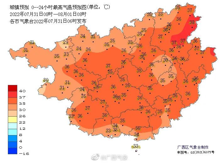 预计,今天白天,贺州、来宾、梧州、贵港、南宁、崇左、玉林、钦州、防城港等市及桂林、柳州、河池、百色四市南部的大部地区最高气温35℃~37℃、局地38℃以上。请注意防范。