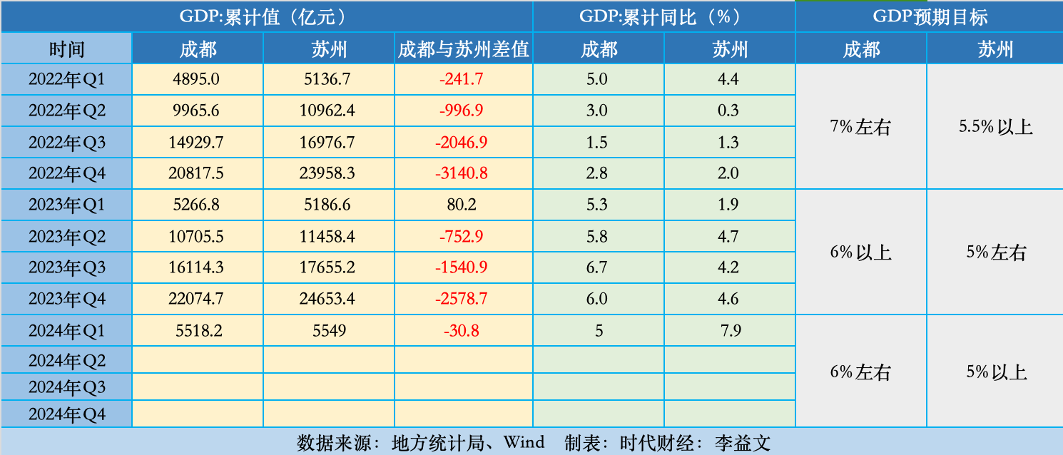 更要紧的是,成都设定的2024年预定经济增长目标为6%左右,但一季度,成都距离预定目标尚有1个百分点的差距。反观苏州,一季度7.9%的增速,超过年初预定目标2.9个百分点。