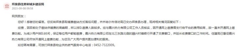人民网哈尔滨9月12日电 (记者陈静)近期,黑龙江省各地供热企业陆续开始收取2023—2024年采暖期供暖费相关工作。齐齐哈尔市拜泉县网民通过人民网“领导留言板”反映,当地嘉兴热力有限公司办理相关业务只收现金,并且缴费要排长队。对此,拜泉县住房和城乡建设局回复表示,为减少用户排队时间,热力公司新开通了缴费窗口,并延长收费窗口的工作时间,同时已督促热力公司尽快开通网上缴费功能,为用户提供便利服务。