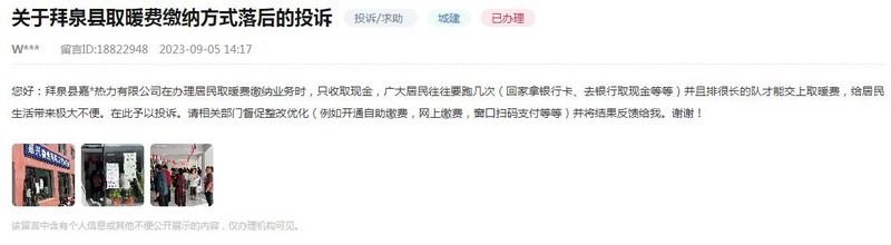 “办理取暖费缴纳业务时,居民往往要跑几次,回家拿银行卡、去银行取现金等,并且排很长的队才能交上取暖费。”该网民表示,请相关部门督促整改优化,例如开通自助缴费、网上缴费、窗口扫码支付等。