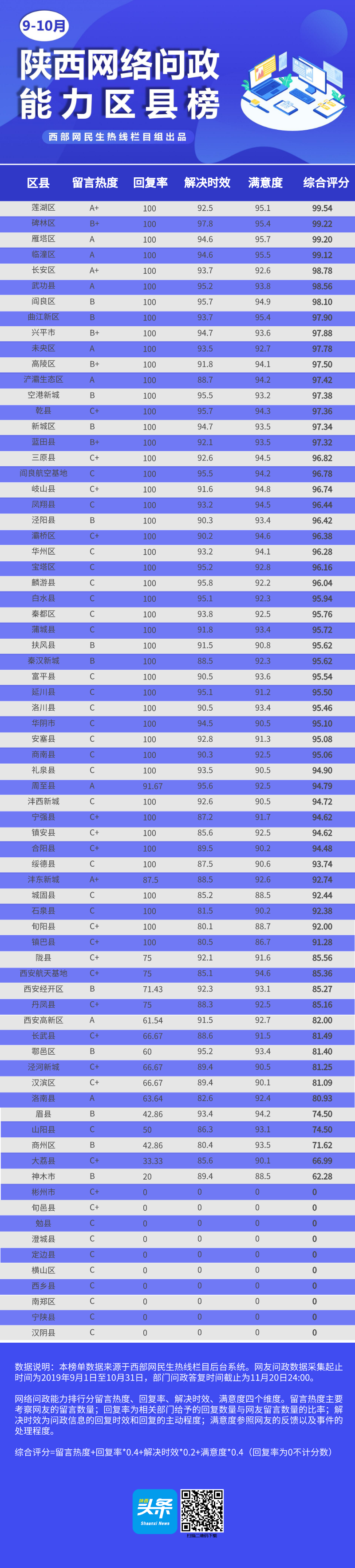 西部网讯(记者 周到)2019年9月—10月,西部网“民生热线”栏目与陕西73个区县(开发区)进行了网络问政沟通对接。根据各区县(开发区)留言热度、回复情况和网友满意度的综合评定,西安莲湖区、西安碑林区、西安雁塔区分别以总分99.54、99.22、99.20位列网络问政能力区县榜前三名。