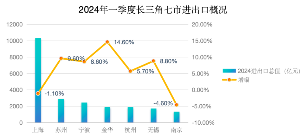 (图为2024年一季度长三角区域七市进出口概况。制表:南财智库研究员 郑康喜;数据来源:海关总署)
