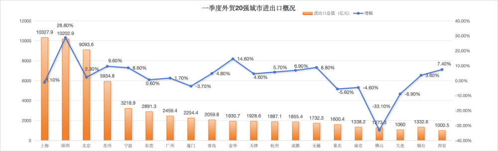 总额上,上海、深圳双双迈上1万亿元台阶,其中深圳外贸进出口总值1.02万亿元,为10年来同期首次突破万亿大关。增速上,深圳以增速28.8%冠绝外贸前二十。此外,苏州、杭州、成都、无锡和西安等5市跑赢了全国增长5%的增速平均线。