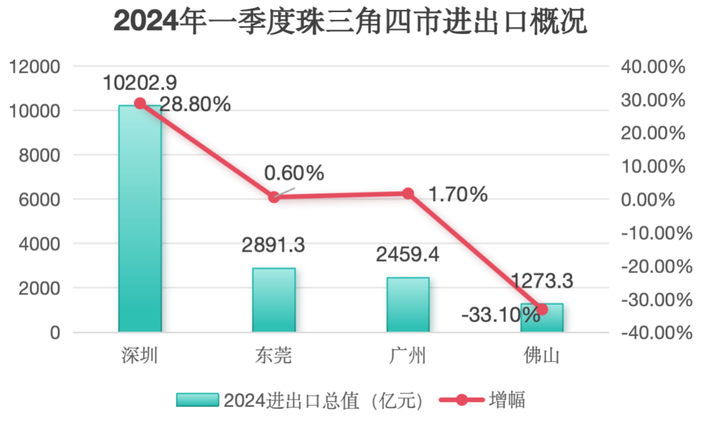 (图为2024年一季度珠三角四市进出口概况。制表:南财智库研究员 郑康喜;数据来源:海关总署)