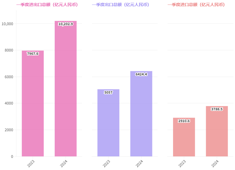 据西安海关统计,2024年一季度,西安外贸进出口总值1000.5亿元,同比增长7.4%。