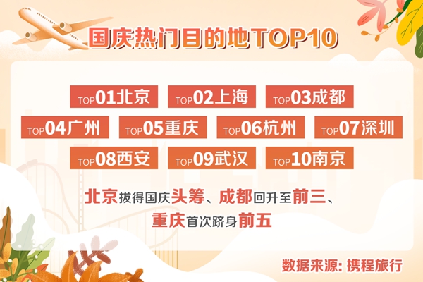 携程平台数据显示:国庆TOP 10目的地为:北京、上海、成都、广州、重庆、杭州、深圳、西安、武汉、南京。受北京环球影城IP带动的关注度提升,北京超越上海、拔得今年国庆目的地头筹;西安再次霸榜国庆TOP10城市行列。