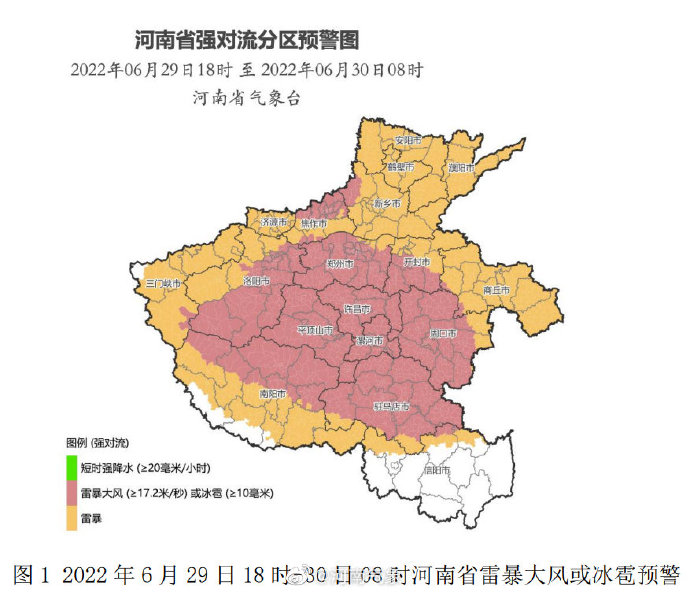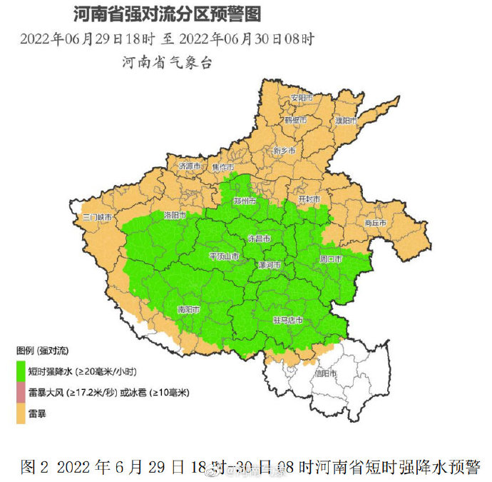 河南省气象台6月29日17时40分发布强对流蓝色预警:预计今天傍晚到夜里,焦作、新乡西部、郑州、开封、商丘西部、洛阳、平顶山、许昌、漯河、南阳、驻马店、周口部分县市将出现8级以上雷暴大风或冰雹天气,局地风力可达11级以上;郑州、开封南部、洛阳南部、平顶山、许昌、漯河、南阳、驻马店、周口部分县市将有短时强降水天气,小时雨量30-60毫米。请密切关注属地最新预报信息和气象灾害预警信号,做好防范应对工作。