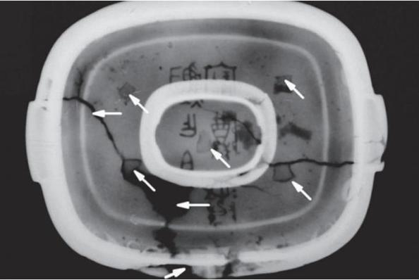 比如下面这件青铜器,通过X光片,可看到口沿上有多条细小裂纹,盖上也曾做过补配,做工相对粗糙,这或许又验证了“眼见不一定为实”的古话。