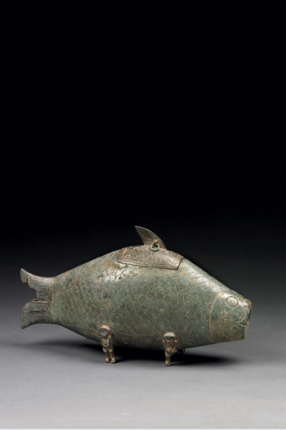 这件鱼形的青铜尊也很有意思,鱼嘴儿一撅,让人不禁好奇:它在为何事发愁呢?更好玩的是,鱼腹下置的四足竟然是四个站立的裸身小人。
