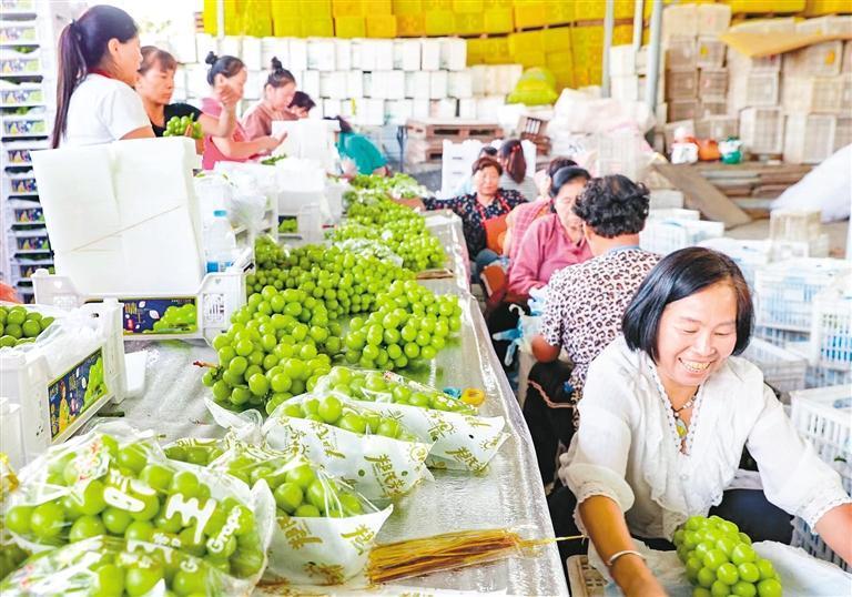 在鄠邑区蒋村街道白龙村,村民们忙着包装客商订购的葡萄。(首席记者 王健 摄 资料图片)