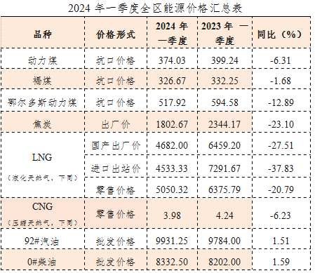 一季度,国内能源生产基本平稳,能源进口稳定增长,主要能源产品普遍供应充足,受气候、春节假日、国际市场价格等因素影响,全区主要能源产品价格普遍下行,与2023年一季度相比,成品油价格小幅上涨,其余能源产品价格不同幅度下降。 一、我区能源市场价格监测情况注:CNG零售价格单位为元/立方米,其余能源价格单位为元/吨(一)动力煤价格2024年一季度,全区动力煤价格先涨后降。1-2月份,受冬季多次冷空气对需求的影响,及春节前后部分煤炭生产企业停产放假对供应的影响,动力煤市场短期供需略有紧张,价格小幅上涨,月度环比分别上涨0.82%、1.04%;3月份开始,国内供应逐步增加,进口持续保持高位,随着气温回升需求有所回落,港口库存累增,产地价格随港口价格下行快速回落。至3月底,全区动力煤坑口平均价格为343.69元/吨,较年初下降10.44%。2024年一季度,全区动力煤平均价格为374.03元/吨,与2023年一季度相比(下称同比)下降6.31%。其中,东部地区褐煤平均价格为326.67元/吨,同比下降1.68%;西部的鄂尔多斯市动力煤平均价格为517.92元/吨,同比下降12.89%。(二)焦炭价格2024年一季度,焦炭价格逐月回落,1-3月份焦炭价格环比分别下降4.15%、2.33%、7.07%,至3月底,全区焦炭平均价格降至1616.00元/吨,较年初下降17.13%。焦炭价格持续下行的原因是:一方面,炼焦煤价格持续回调,成本支撑不再,另一方面,下游需求偏弱,粗钢产量同比下降,且市场预期不乐观,钢厂对焦炭等原材料采取低库存策略。在成本支撑不足、需求较弱、供应能力充足的共同作用下,一季度焦炭同比大幅回落,全区焦炭1-3月份平均价格为1802.67元/吨,同比价格下降23.10%。 (三)天然气价格2024年一季度,天然气LNG市场供应充足、进口价格持续下跌,全区LNG价格持续下行。春节前后,因气温阶段性回升、终端企业放假等因素,市场价格开始下行趋势,此后随着气温回暖、进口增加,市场竞争激烈,价格下行加快。至3月底,全区国产LNG平均出厂价、进口LNG平均出站价、LNG零售价格分别为4376.00 元/吨、4200.00元/吨、4555.71元/吨,较年初分别下降19.94%、10.64%、22.73%。一季度,全区CNG零售价格1-2月稳定在3.97元/立方米,3月份涨至3.99元/立方米。 从价格总水平来看,1-3月亚太地区JKM指数(Japan-KoreanMarker,普氏日韩标杆天然气价格指数)均价为9.4美元/百万英热单位,同比下降44%,在供应宽裕、进口成本下降的共同作用下,LNG价格同比大幅回落。一季度,全区国产LNG平均出厂价、进口LNG平均出站价、LNG零售价格、CNG零售价格分别为4682.00元/吨、4533.33元/吨、5050.32元/吨、3.98元/立方米,同比价格分别下降27.51%、37.83%、20.79%、6.23%。 (四)成品油价格2024一季度,成品油价格“三上一下两搁浅”,至3月底,92号汽油、95号汽油、0号柴油、-35号柴油平均批发价格分别为每吨10123元、10696元、8510元、9787元,汽、柴油价格较年初分别上涨2.96%、3.28%,同比汽、柴油价格分别上涨1.81%、1.98%。二、我区能源价格后期走势预测一季度,我国GDP同比增长5.3%,增速较上个季度加快0.1个百分点,经济运行实现良好开局。二季度,支撑经济继续回升向好的积极因素累积增多,首先,世界经济回暖,世贸组织预计今年全球货物贸易量增长可能达到2.6%,有利于我国出口需求的支撑;其次,从PMI(采购经理指数)等先行指标来看,中国经济进一步回暖,在积极的财政政策和扩大需求等一系列政策的推动下,预计二季度中国经济将延续恢复向好态势。经济的向好推动二季度能源消费总量延续稳步增加趋势。(一)煤炭价格预测一季度,原煤生产下降,进口保持增长。1—3月份,规上工业原煤产量11.1亿吨,同比下降4.1%;进口煤炭1.2亿吨,同比增长13.9%,综合测算总供应量同比下降约2.66%。按照山西等煤炭主产区关于煤炭保供的安排,预计二季度煤炭产量还有一定上升空间。从一季度进口增量情况来看,恢复煤炭进口关税对进口总量影响程度有限,但随着国际动力煤价格上涨,进口动力煤优势不再显著,预计二季度动力煤进口量将有所减少。从一季度制造业和基础设施投资、出口数据来看,制造业和基础设施投资支撑有力,出口增长超过预期,均有利于支撑煤炭总需求增长。一季度新能源装机同比均保持较快增速,进入二季度南方水电出力增加,新能源装机和出力快速增长,将继续替代部分煤炭需求。在经济回升向好、工业需求回升支撑下,尽管能源替代增加,二季度动力煤需求有望保持增长趋势。从各环节库存来看,截至3月末,全国煤炭企业存煤6600万吨,同比增长3.0%;我国火电厂存煤约1.8亿吨,同比增长约1700万吨,可用约26天;3月末,我国主要港口存煤5781万吨,同比下降7.8%;其中环渤海主要港口存煤2366万吨,同比下降13.2%。尽管港口存煤同比有所回落,但仍高于近3年最低水平,各环节偏高的库存对二季度价格稳定仍起到支撑作用。综合来看,二季度我国动力煤供应将维持高位,需求将保持增长,动力煤供需关系总体将基本平衡,动力煤市场价格或将以稳为主、窄幅波动。(二)焦炭价格预测对于供应充足的焦炭行业,需求、成本和预期是影响价格的关键因素。从需求来看,随着增发国债、特别国债等政策的落地,预计二季度固定资产、制造业投资和基础设施投资还将保持快速增长,有助于拉动焦炭下游的钢材需求;从成本来看,因山西炼焦煤产量大幅下降,今年以来炼焦煤供应小幅减少,且行业内持续的低库存导致供给弹性较小,在