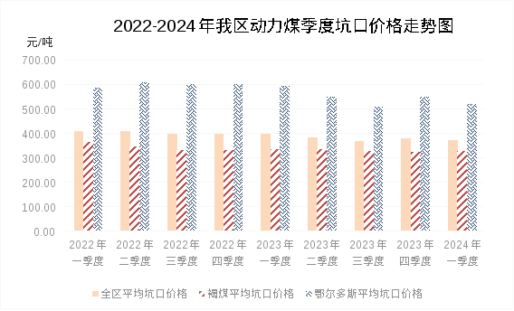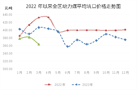 2024年一季度,全区动力煤价格先涨后降。1-2月份,受冬季多次冷空气对需求的影响,及春节前后部分煤炭生产企业停产放假对供应的影响,动力煤市场短期供需略有紧张,价格小幅上涨,月度环比分别上涨0.82%、1.04%;3月份开始,国内供应逐步增加,进口持续保持高位,随着气温回升需求有所回落,港口库存累增,产地价格随港口价格下行快速回落。至3月底,全区动力煤坑口平均价格为343.69元/吨,较年初下降10.44%。