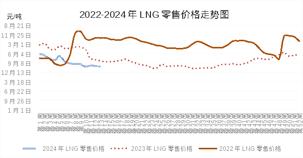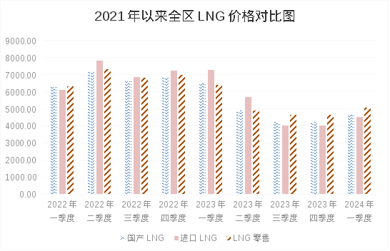 2024年一季度,天然气LNG市场供应充足、进口价格持续下跌,全区LNG价格持续下行。春节前后,因气温阶段性回升、终端企业放假等因素,市场价格开始下行趋势,此后随着气温回暖、进口增加,市场竞争激烈,价格下行加快。至3月底,全区国产LNG平均出厂价、进口LNG平均出站价、LNG零售价格分别为4376.00 元/吨、4200.00元/吨、4555.71元/吨,较年初分别下降19.94%、10.64%、22.73%。