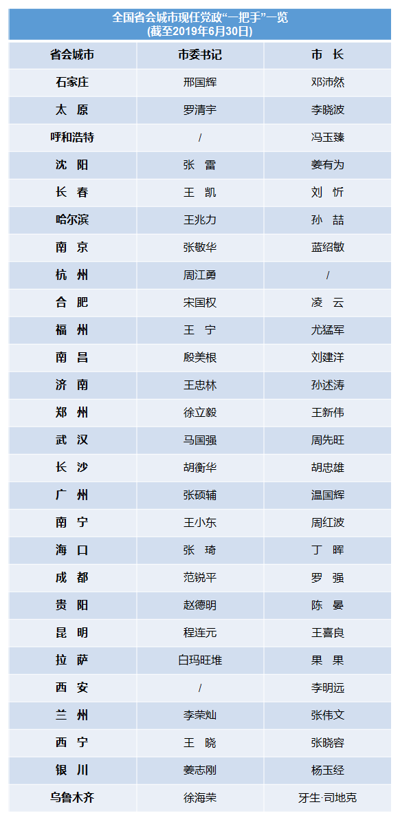 经过上半年的人事调整后,除呼和浩特市委书记、西安市委书记、杭州市市长外,全国27座省会城市党政“一把手”岗位已全部配齐,具体情况如下: