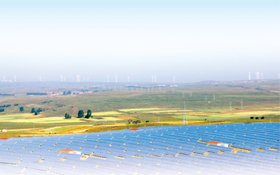 从张家口市区驱车一路向北,上百米高的白色大风机成群结队矗立在广袤草原上,成为一道道亮丽风景。一排排深蓝色的光伏发电板栉比相连,在太阳的照射下熠熠生辉。