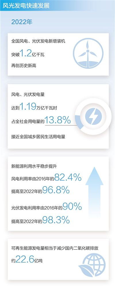 气象高质量发展,有力服务保障能源产业绿色低碳转型。大力发展新能源已成为我国纵深推进能源革命、保障国家能源安全的重大举措,也是实现“双碳”目标的重要方面。近年来,我国新能源气象服务能力不断提升,通过精密监测、精准预报、精细服务,大自然的风、光变得可预测、可利用,源源不断转化为绿色电力。2022年,我国风电、光伏发电新增装机突破1.2亿千瓦,连续3年超过1亿千瓦。气象高质量服务保障有效助力新能源发展,为推动实现“双碳”目标作出贡献。