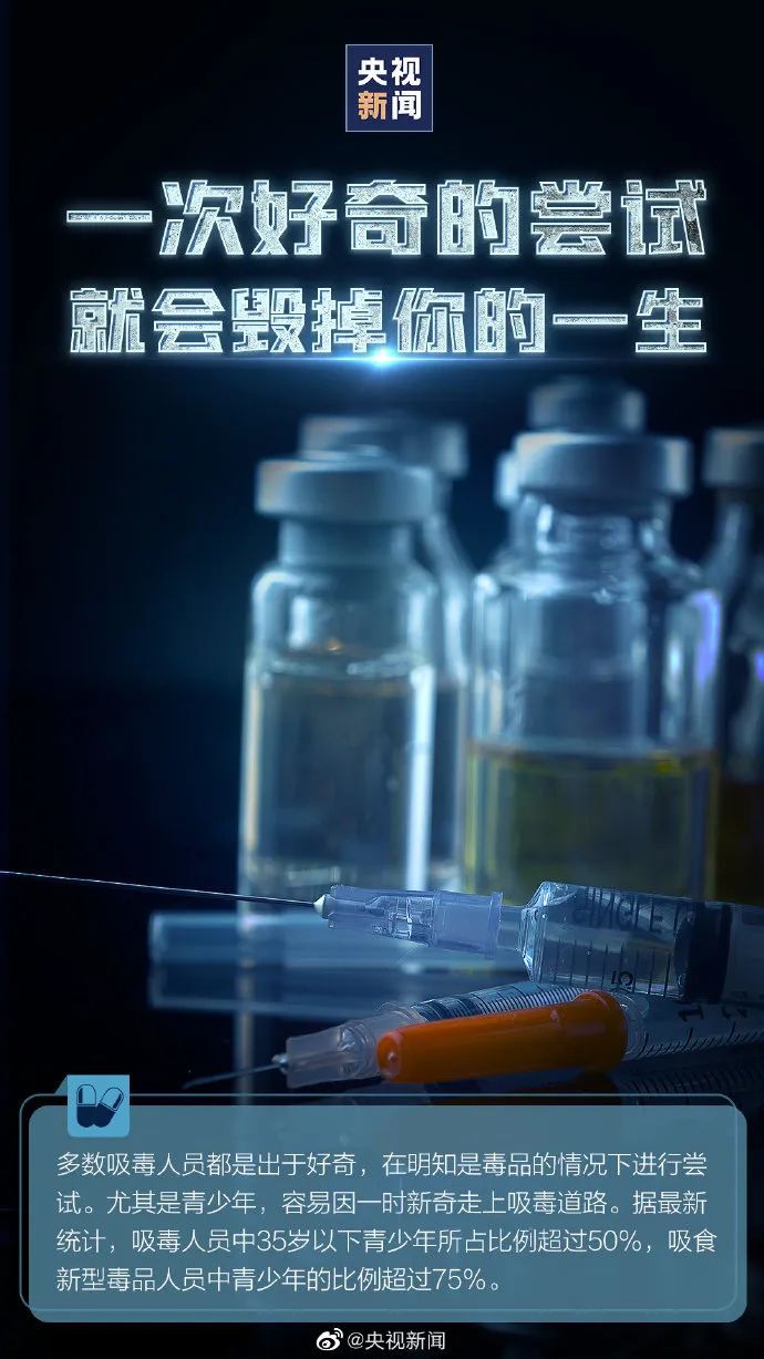 6月26日是国际禁毒日。禁毒和抗“疫”一样,都需要人民战争。希望每个人都能牢记三个数:对吸毒要坚决0容忍;一次好奇尝试会毁掉一生,千万别尝试“第1口”;毒品可能会穿着N多种外衣,必须警惕“毒友”递来的新奇物件!