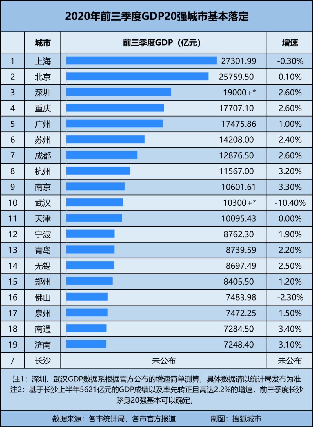 根据目前主要城市晒出的2020年前三季度经济“成绩单”,全新GDP20强城市已基本落定。第三季度整体经济加快复苏,相比上半年各市增速都有较大回升,仅有武汉、上海、佛山增速仍为负。同时,20强城市的名单有了新的变化。