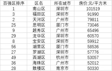 这其中,12个房价超过5万元/平方米的百强区,分别是深圳南山区、深圳福田区、广州天河区、厦门思明区、广州越秀区、深圳龙华区、深圳宝安区、厦门湖里区、深圳罗湖区、杭州西湖区、广州海珠区、南京鼓楼区。从区域分布来看,这12个区来自深圳、广州、厦门、南京、杭州这5个副省级城市,这些城市都位于东南沿海的经济强省。