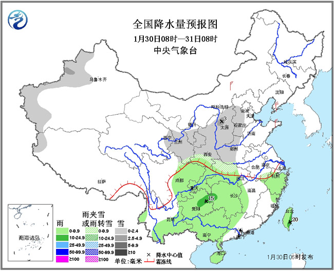 图1 全国降水量预报图(1月30日08时至31日08时)