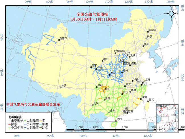 图3 全国公路气象预报图(1月30日08时至31日08时)