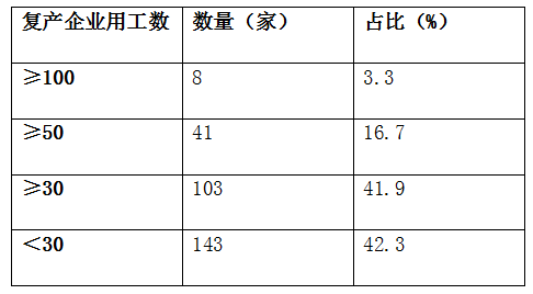 以该市最新批次复工企业为例,246家复工企业中,复工总人数仅有8084人次。其中,复工人数达到100人的企业仅8家,占总数的3.3%,50人以上的41家,占总数的16.7%,少于30人的企业达到143家,占总比例的42.3%。具有强大生产产能的规上企业,绝大多数的生产人数都无法达到50人,远远少于正常用工量。详细数据见下表。