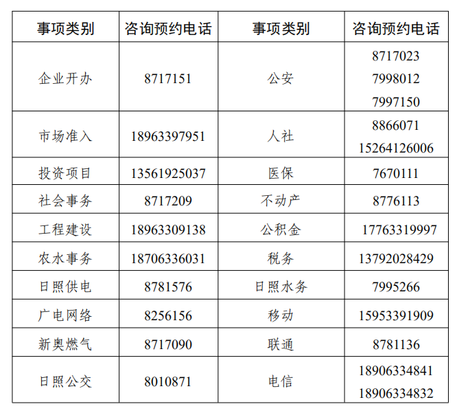 一、市政务服务大厅全面推行“预约服务”。需办理政务服务业务的企业和群众,可拨打相应的咨询电话进行预约,值班人员将第一时间响应您的业务办理需求(预约电话详见附表)。