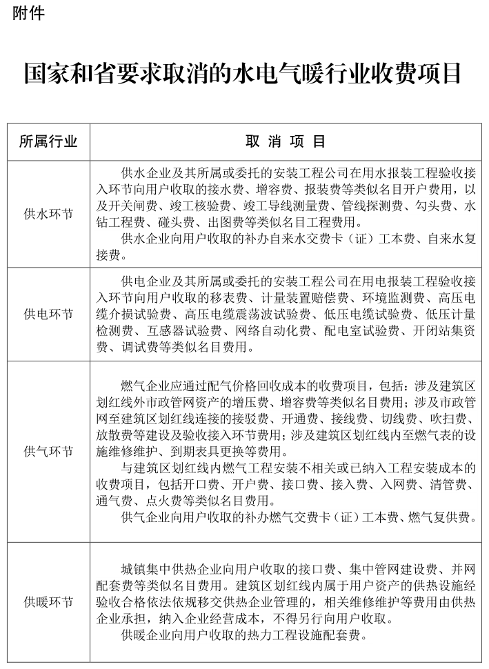 1﹒规范政府定价行为。完善城镇供水供电供气供暖成本监审和定价办法,明确成本构成,细化职工薪酬、折旧费、损耗等约束性指标,合理制定价格。强化成本和价格信息公开,保障用户知情权。对居民燃气工程安装费、燃气设施移改费等市场竞争不充分、仍具垄断性的少数涉及供气行业的经营服务性收费,授权市、县人民政府实行政府定价或政府指导价。具备条件的地区,可实行市场调节价。(责任单位:省发展改革委、省住房城乡建设厅与各市、县人民政府)