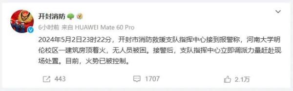 据此前报道,5月3日1时,@开封消防 通报称,2日23时22分,开封市消防救援支队指挥中心接到报警称,河南大学明伦校区一建筑房顶着火,无人员被困。接警后,支队指挥中心立即调派力量赶赴现场处置。目前,火势已被控制。