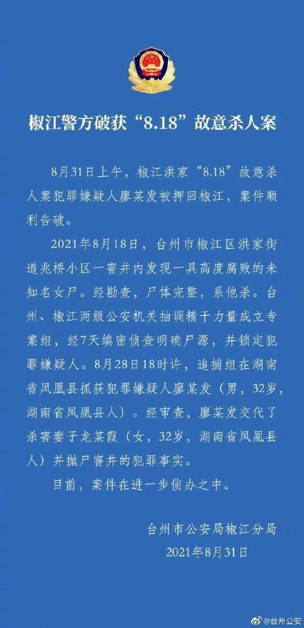 据@台州公安 消息,8月31日上午,椒江洪家“8.18”故意杀人案犯罪嫌疑人廖某发被押回椒江,案件顺利告破。经勘查,尸体完整,系他杀。台州、椒江两级公安机关抽调精干力量成立专案组,经7天缜密侦查明确尸源,并锁定犯罪嫌疑人。8月28日18时许,追捕组在湖南省凤凰县抓获犯罪嫌疑人廖某发(男,32岁湖南省凤凰县人)。经审查,廖某发交代了杀害妻子龙某霞(女,32岁,湖南省凤凰县人)并抛尸窨井的犯罪事实。