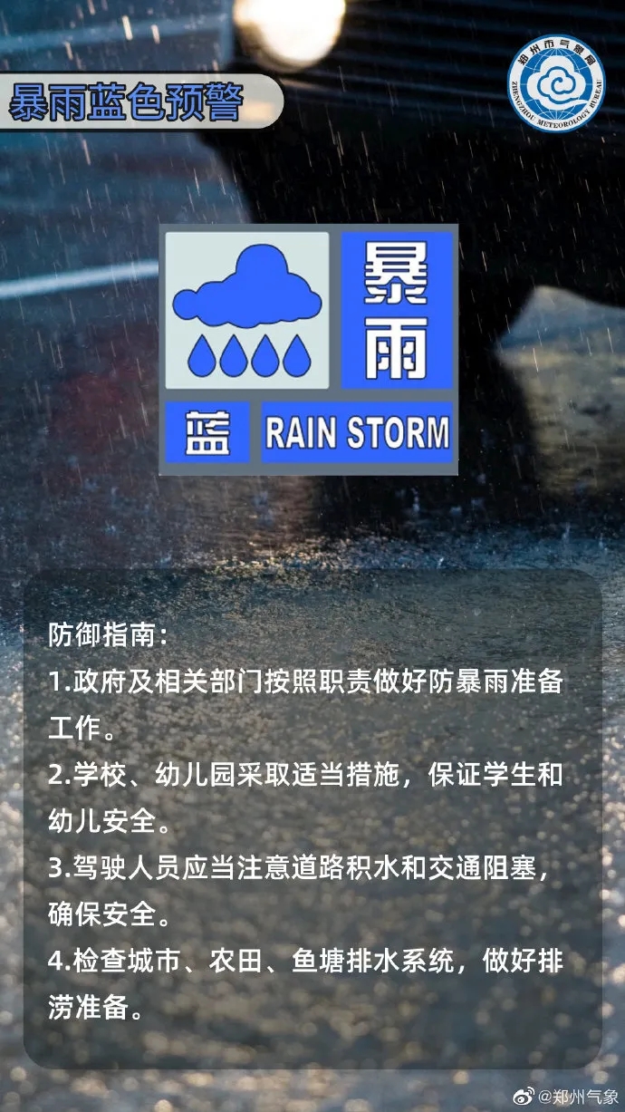 郑州市气象台2021年09月01日05时15分发布暴雨蓝色预警信号:预计未来12小时内,巩义、登封、荥阳、郑州市区、中牟北部降水量将达50毫米以上,请注意防范。