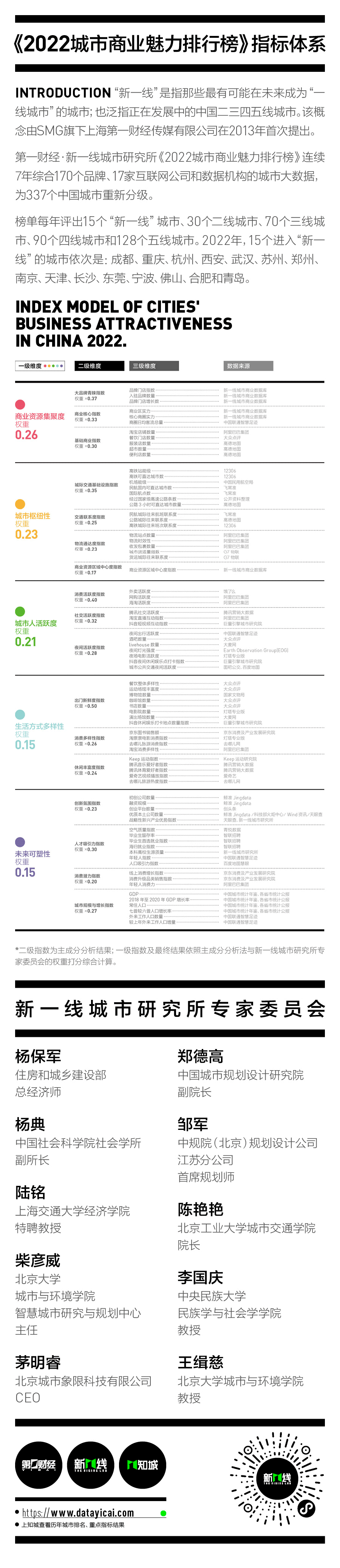 采用170个主流消费品牌的商业门店数据、17家各领域头部互联网公司的用户行为数据和数据机构的城市大数据,《城市商业魅力排行榜》每年都围绕商业资源集聚度、城市枢纽性、城市人活跃度、生活方式多样性和未来可塑性五大一级维度来评估337座地级及以上城市的发展情况。