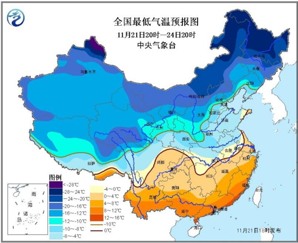11月24日凌晨,华北平原北部最低气温将达到-10℃左右,最低温度0℃线将位于江南北部,江南南部和华南北部最低气温将达到4~8℃。中央气象台11月21日18时继续发布寒潮橙色预警。