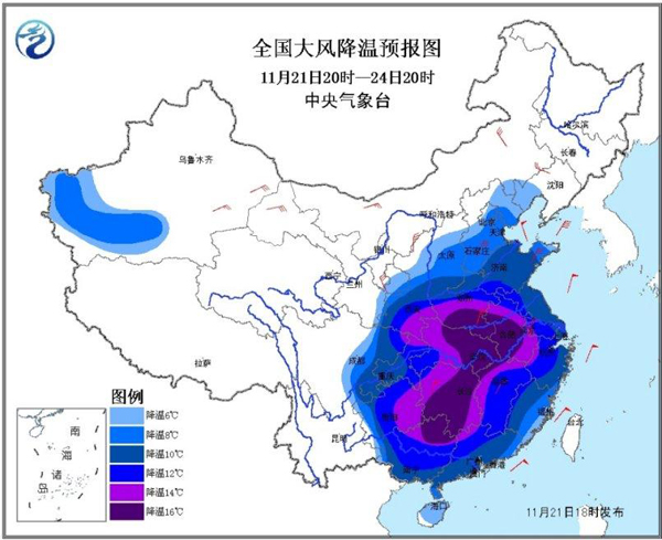 受寒潮影响,11月21日夜间至24日,我国中东部大部地区有大范围大风降温天气,平均气温将普遍下降6~10℃,其中,陕西南部、黄淮中西部、江淮中西部、江汉、江南中西部、华南北部以及四川东北部、重庆东部、贵州中东部等地气温将下降12~14℃,河南南部、安徽西部、湖北中东部、湖南大部、广西东北部等地的部分地区降温可达16℃以上。上述地区伴有4~6级偏北风,东部和南部海区风力有7~8级,阵风9~10级。