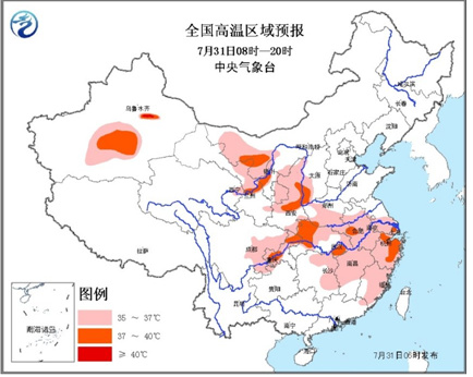 人民网北京7月31日电 中央气象台监测,昨日,我国出现大范围高温天气,西北地区、黄淮、江淮、江南以及西南东部地区的气温均超过35℃,高温影响涉及十余省市,其中新疆南部、内蒙古西部、陕西关中、山西西南部、河南西北部、湖北西北部、上海、浙江东北部等地最高气温达37~39℃,新疆吐鲁番局地40~43℃。