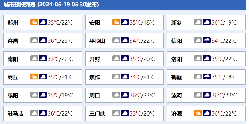 5月18日,据河南气象消息,河南省气象台预计,19日下午至20日白天,河南省北部、中西部、西南部将有散性阵雨、雷阵雨,部分县市伴有雷暴大风、短时强降水等强对流天气。详情>>