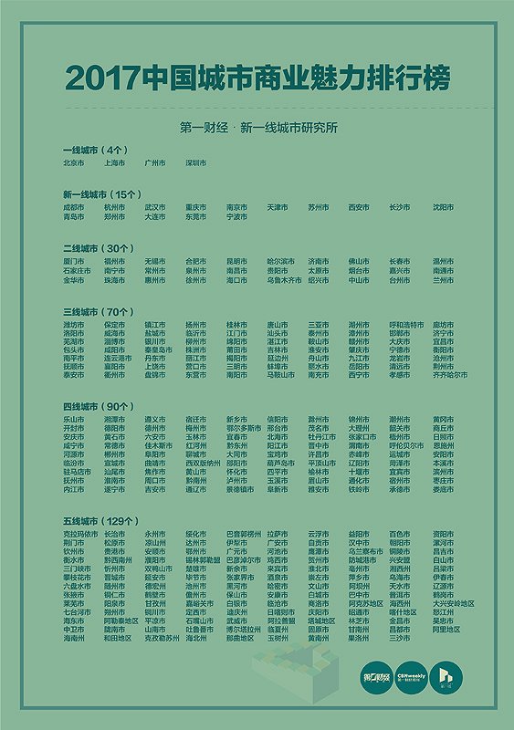 中国城市的进化并不是只有一条确定的道路,沿着自己最擅长的轨迹,才会成为人们心中那个特别的城市。新一线城市研究所根据最新一年的160个品牌商业数据以及美团大众点评数据研究院、飞常准、京东、饿了么、淘宝网、第一财经商业数据中心、时光网、支付宝、知乎、智联招聘、TalkingData、滴滴出行、优酷、去哪儿、咕咚、青悦开放环境数据中心、高德地图交通大数据等17家互联网公司的用户行为数据和数据机构的城市大数据,沿用上一年的商业资源集聚度、城市枢纽性、城市人活跃度、生活方式多样性和未来可塑性五大指标,邀请新一线城市研究所专家委员会为五大指标的权重赋值,以专家打分法的方式计入评分体系;并在二级指标以下的数据中分析采用了主成分分析法客观赋权,做出了这份大榜单,为338个中国城市再分级,评出4个一线城市、15个“新一线”城市、30个二线城市、70个三线城市、90个四线城市和129个五线城市。
