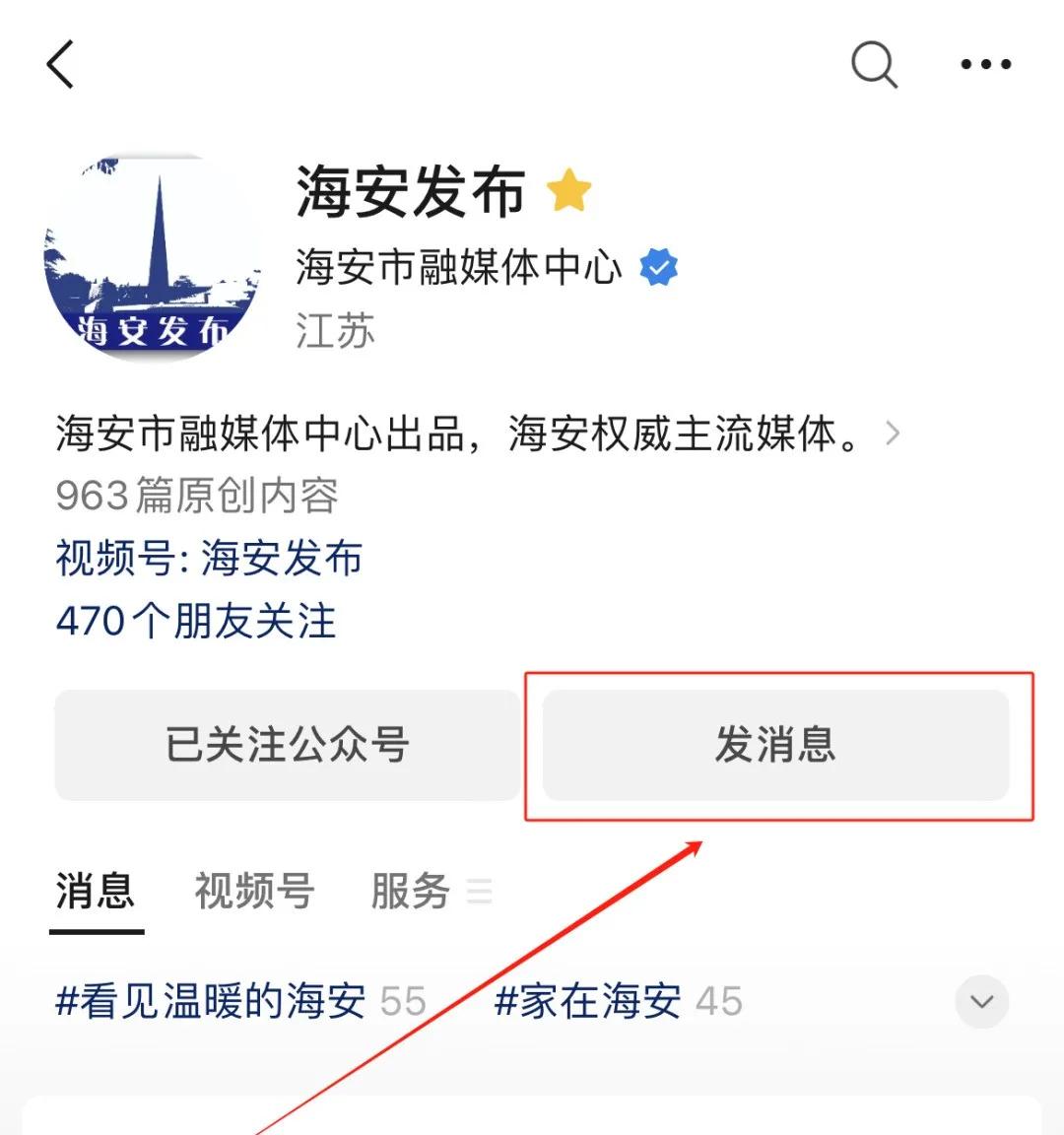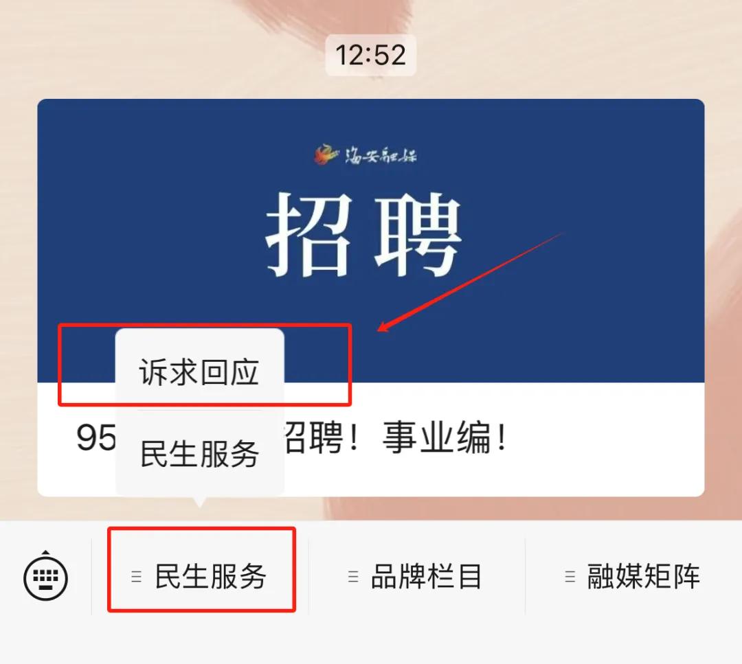 在“海安发布”公众号页面,点【发消息】—【民生服务】—【诉求回应】,进入【民生服务直通车来信答复专栏】,点进去可查看诉求反馈。