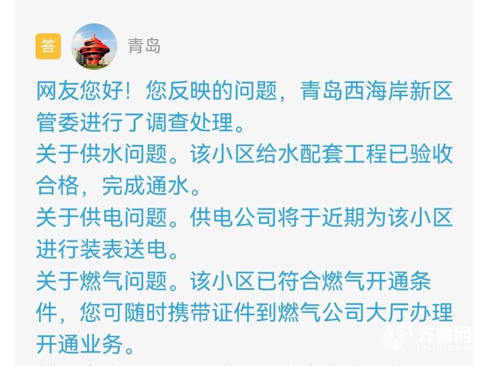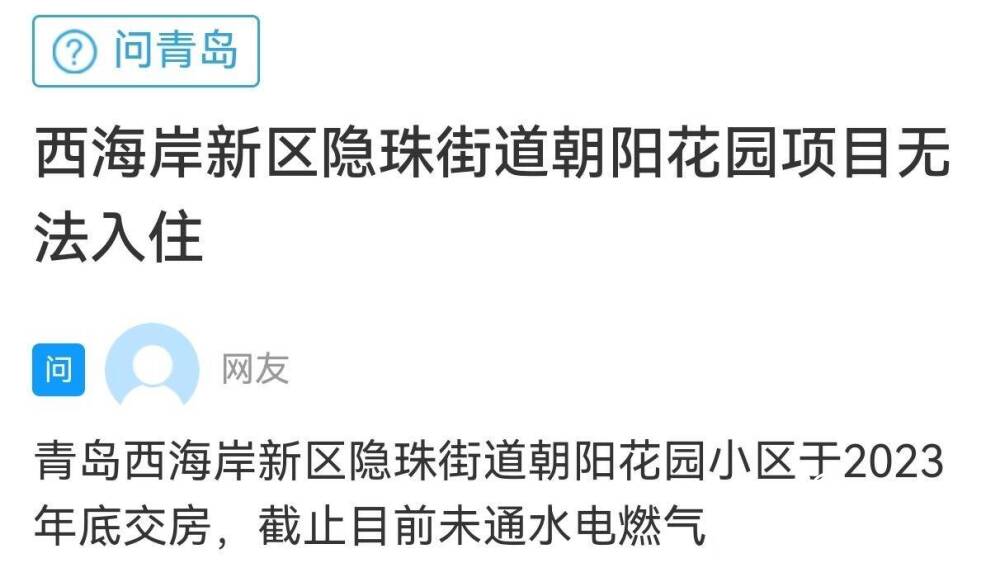 齐鲁网·闪电新闻5月20日讯 青岛的一位网友,在《问政山东》网络问政平台留言:青岛西海岸新区隐珠街道朝阳花园小区于2023年底交房,截至目前未通水电燃气,无法入住。