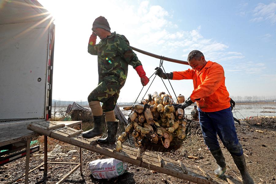 2021年12月28日,安徽省全椒县十字镇汊河村,藕农在搬运刚刚采收的莲藕。图|新华社