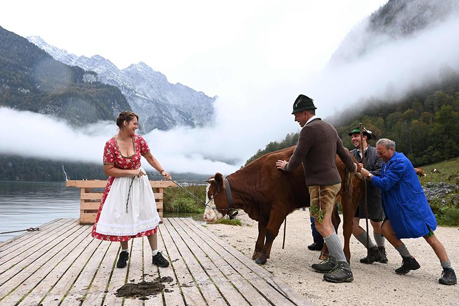 2020年10月2日,德国牧民在巴伐利亚州舍瑙附近将牛只拉上船,准备运往山谷的牧场过冬。