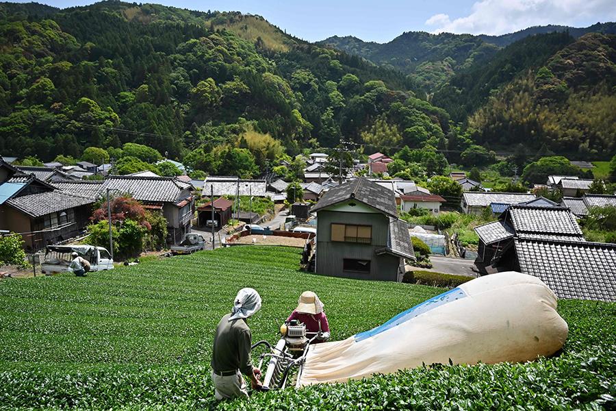 2019年5月16日,日本静冈县农民在采收茶叶。