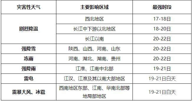 央视网消息:中央气象台预计,2月17日至22日寒潮天气将影响我国,中东部地区气温起伏剧烈,大部地区降温10~18℃,局地气温降幅可达20℃以上;全国大部有明显雨雪天气,其中陕西、山西、河南、山东等地有暴雪,局地大暴雪;河南、湖北、湖南、贵州将先后出现冻雨;江淮、江南中北部局地有暴雨,南方地区有大范围雷电和局地强对流天气。